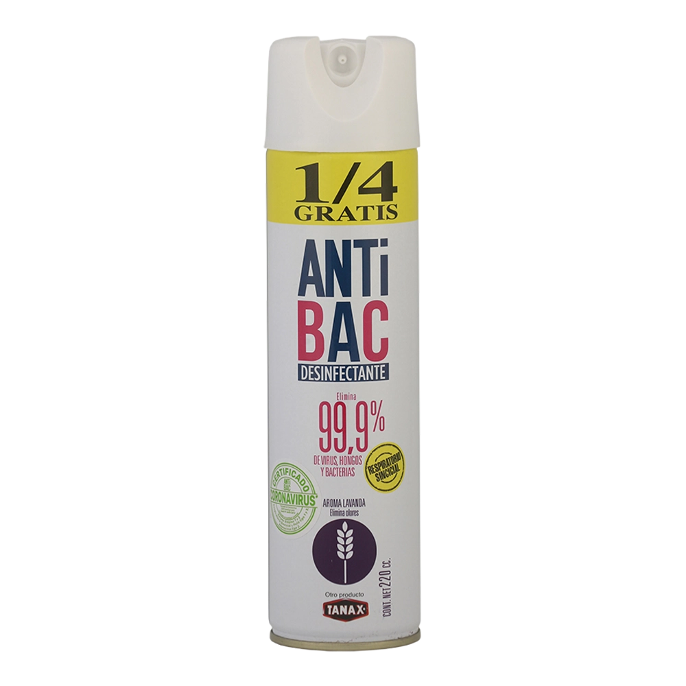 Modo de uso: Pulverizar en el ambiente o directamente sobre la superficie a tratar. Dejar actuar unos segundos y limpiar con paño. ANTIBAC Desinfecta ambientes, superficies y elimina hongos que producen malos olores.